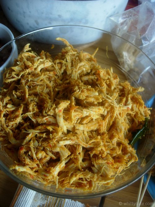 1 whole chicken, weighing about 1.2 kg (2 ½ lb) (we used 500 gr boiled chicken meat, stripped)
